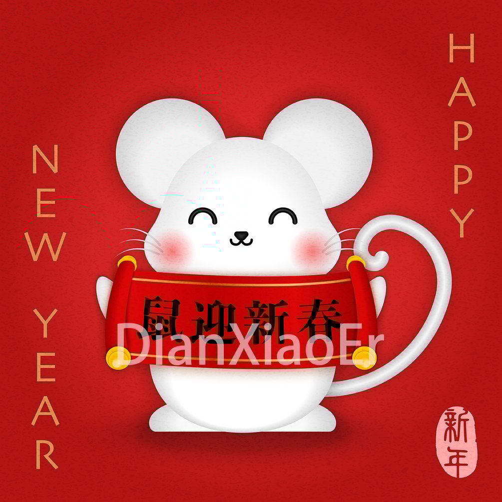 向量(矢量)中國節慶 農曆新年春節 黃金鼠年 卡通造型鼠 捲軸春聯 Vector illustration of Happy Chinese new year of cute cartoon mouse with smiling face holding spring couplet