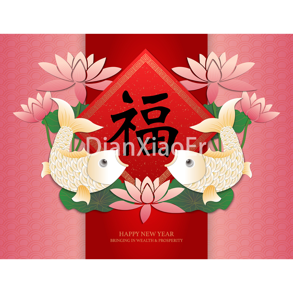 向量(矢量)中國節慶 農曆新年春節 年年有餘 福字春聯 蓮花 鯉魚 造型紙浮雕 Vector illustration of Happy Chinese new year of relief lotus flower fish and spring couplet