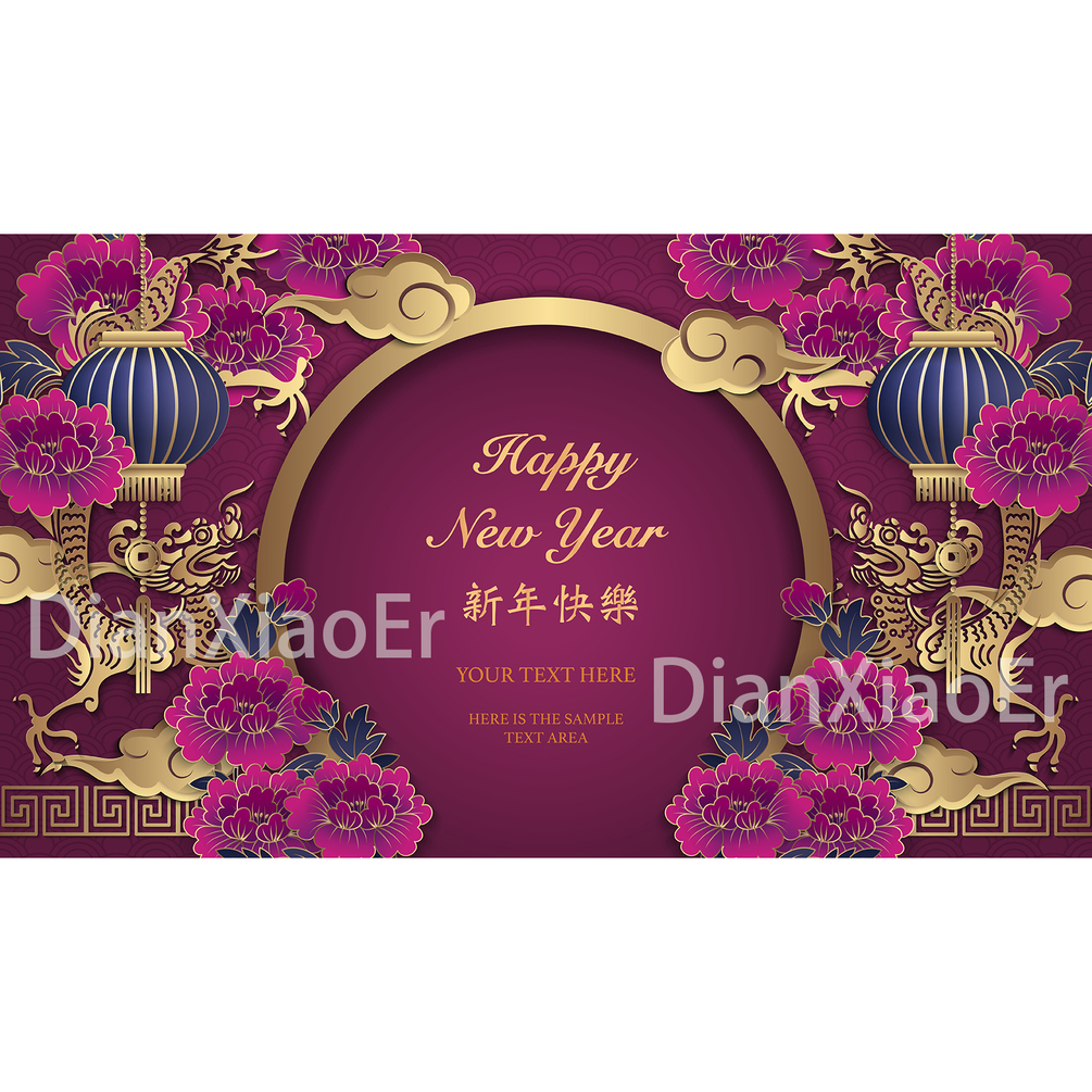 【 向量(矢量)中國節慶 農曆新年春節 富貴紫牡丹 黃金龍 燈籠 圓型拱門浮雕 】