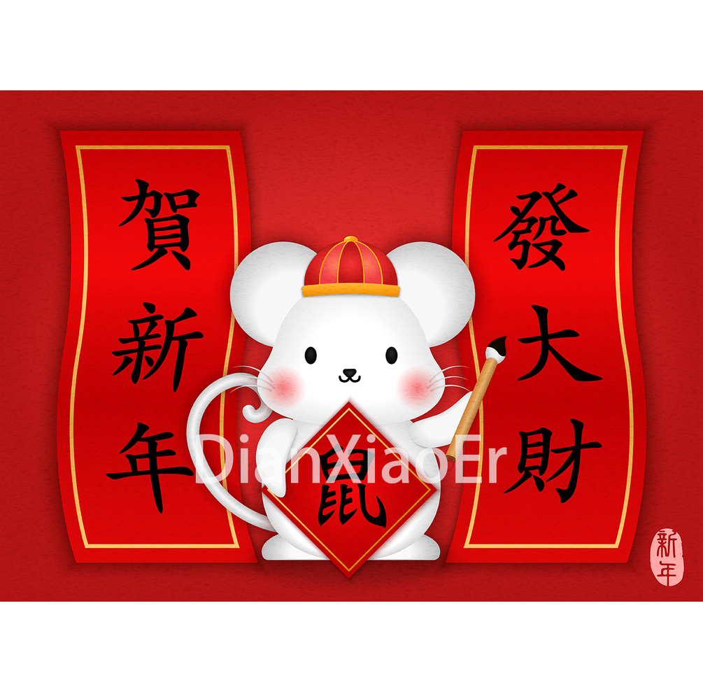 向量(矢量)中國節慶 農曆新年春節 黃金鼠年 卡通造型鼠 書法毛筆寫春聯 Vector illustration of Happy Chinese new year of cute cartoon rat mouse holding Chinese brush and spring couplet